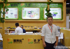 Shi Aijun from Beijing Baihuan Xiandai Nongye Company. They sell apples. // 来自北京百环现代农业有限公司的副总经理史爱军,他们销售苹果。