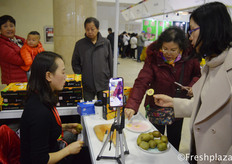 Visitors tasting the Red hearted kiwi fruit from Shanghai Yi Kailong Network Technology Co. Ltd. // 访客品尝上海益凯龙网络科技有限公司的红心猕猴桃。