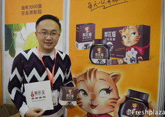 Jason from Li huamao. They sell pear syrup and also canned yellow peaches. Their pears are produced in Anhui and 30% is sold as fresh fruit and about 70% of the output is used to make pear syrup. // 来自安徽梨多宝食品营销有限公司的胡义杨,他们销售梨糖浆和罐装黄桃。他们的梨是在安徽生产的,30%作为新鲜水果出售,约70%的产量用来制作梨糖浆。