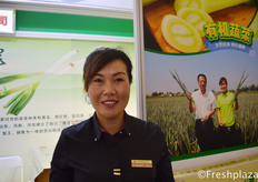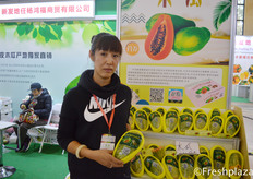 Becky from DD Agriculture, she shows the packaging with the Weys Citrus from Sichuan, Meishan. They had a good promotion strategy during this fair, everyone who scanned their wechat QR code could get a free citrus. They sell them in online stores, like Jingdong and their WeChat account. // 来自鼎德华夏农业科技集团的生鲜事业部销售经理纪金良,她展示了来自眉山四川的Weys柑橘包装。在这个交易会上,他们有一个很好的促销策略,即每个人扫描他们的微信QR码可以得到免费柑橘。他们在网上商店销售,比如京东和他们的微信账户。