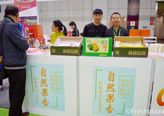 Mr. Chang Zhongjie and Mr. Su from Hainan Natural fruit scent Agricultural Development Co., Ltd. They are specialised in selling tropical fruits from Hainan. 海南自然果香农业开发有限公司的常中杰先生和小苏,该公司专门销售来自海南的热带水果。