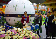 Jiangsu Sheng Senyue Guopin Limited, presenting their fresh durian. 江苏省森悦果品有限公司正在展示他们的新鲜榴莲