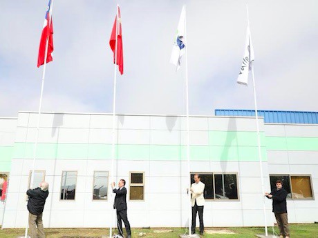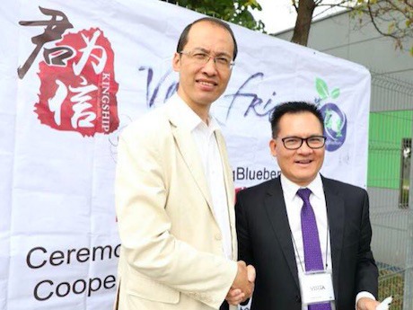 2018.04.23日13:48分,智利全球著名水果产区库里克Vallefrio工厂大门口,由Vallefrio公司董事长Juan Sebastian Moreno Urzua先生、君为信董事长李汉清先生、信业基金董事总经理首席财务官任烨先生和Vallefrio公司总经理Jose Pedro Moreno及营运经理Diego先生,在智利外国投资局等政府、媒体和近100名员工的见证下,分别将智利国旗、中国国旗、蓝莓皇KingBlueberry品牌旗和Vallefrio公司旗同时徐徐升起!标志着“蓝莓皇KingBlueberry”品牌合作正式开始。