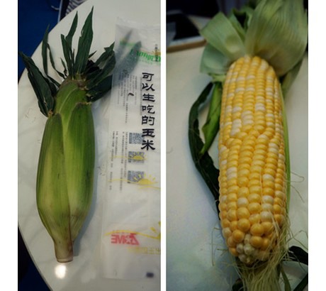 杨天龙带来的玉米,确实和普通玉米不同。 他的玉米是可以生吃的果蔬粮三合一“水果玉米”。 相比普通玉米,从外形上来看,这种玉米两侧有更多的叶子而不是须。 打开来看,区别于普通玉米的黄色内里,里面的玉米粒黄白相间,比例在7:2左右。根据现场的试吃体验,这种玉米可以生吃,水煮,烤,榨汁。 由于玉米本身皮薄糖度高(高于西瓜糖度),生吃是口感十分清脆香甜。水煮或烤制后,玉米香气更重,口感却依旧清脆。