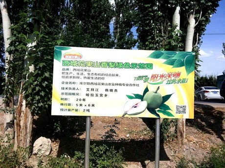 库尔勒西域花果山农业种植专业合作社位于新疆库尔勒市, 是新型产、供、销一体化企业,巴音郭楞蒙古自治州示范合作社之一。 “现在,我们合作社不仅有920亩绿色香梨生产基地一个,800亩无公害红提生产基地一个,1100亩无公害哈密瓜瓜生产基地一个, 而且还建成了总面积达3000吨保鲜库一座,合作社可以自己对瓜果进行分选、清洗、包装、加工和储藏。同时我们还推出了自己的品牌‘西域花果山’—被阳光亲吻过的水果,将新疆瓜果的甜蜜作为一个卖点”王琦女士介绍说。