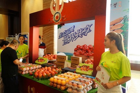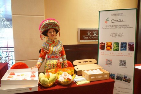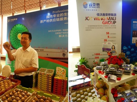 陕西齐峰果业有限公司总经理齐峰先生向来宾展示齐峰猕猴桃 (左边). 佳沃鑫荣懋带来了蓝莓、哈密瓜、柑橘、车厘子等产品(右边).