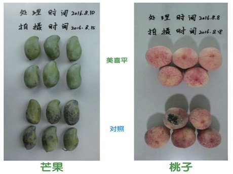 在芒果和桃子上施用Mecypro前后的效果对比图