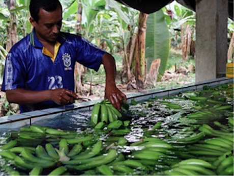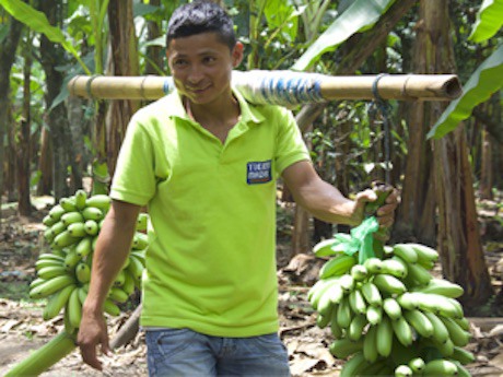厄瓜多尔蕉农正在运输刚刚采摘的香蕉