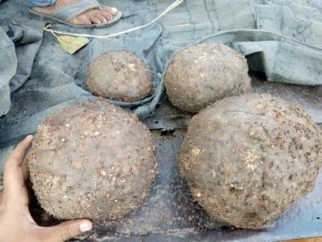 象蹄芋可重达1.5至6公斤。人们通常将象蹄芋煮熟后食用。“象蹄芋的茎和叶也可以食用,不过这些菜只有农民自己会做。”Binu说道。