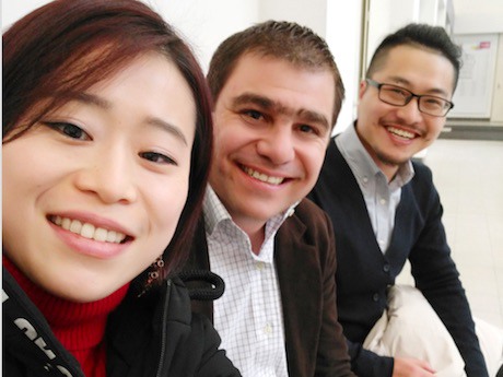Cydiance的Tina Sun(左)及Austin Gu(右)与中美洲客户Rafael在柏林果蔬展会上