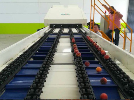 该四车道分选机生产线主要的分选对象是圆形,椭圆形的,直径在5公分-12公分左右的水果,例如脐橙,柠檬和桔子等柑橘类产品,以及李子,桃子和油桃等核果类水果。