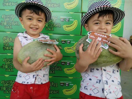亲亲果园和维吉达尼新疆团队阿布的双胞胎儿子手捧热销水果
