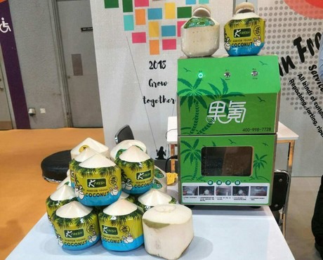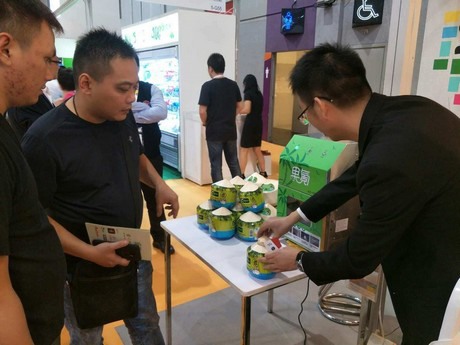 在香港水果蔬菜展览会给客户介绍椰子开启器