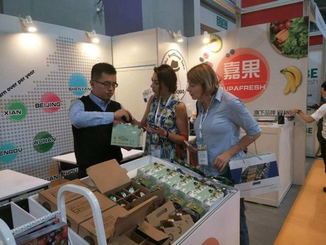在香港水果蔬菜展览会客户对特殊的鳄梨盒子很有兴趣