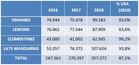 智利柑橘对所有市场的出口量(公吨),其中最大的出口市场是美国市场。