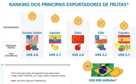 “巴西在世界水果出口国排名中排名第16位(根据粮农组织数据,联合国粮食及农业组织和农业计算得出)。美国和厄瓜多尔的销售额是巴西销售额的四倍。 这是根据从芒果,甜瓜,酸橙/柠檬,葡萄,木瓜,西瓜,香蕉和苹果等主要国家水果出口收集的信息所得,”HF Brasil在他们最新的杂志中报道的。