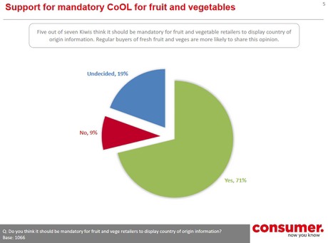 Hort NZ开展的一项研究发现,71%的消费者支持强制性原产国标识系统,因为该国仅在自愿系统下运行这一系统。47%的消费者对“知道果蔬来自哪里很重要”这一点“强烈同意”。