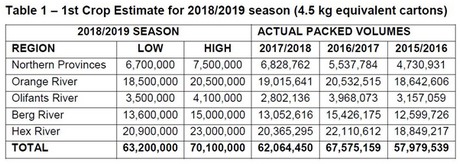 南非鲜食葡萄协会 (SATI)今天公布了葡萄收获的统计数据。 2018/2019年的第一季作物估计数保持不变,估计产量为63,200万至7,100万箱(每箱约4.5千克)。