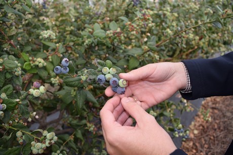 Carlos Franco 向我们展示了成熟的蓝莓(左)和待成熟的蓝莓(右)之间的区别。