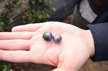 Carlos Franco 向我们展示了成熟的蓝莓(左)和待成熟的蓝莓(右)之间的区别。