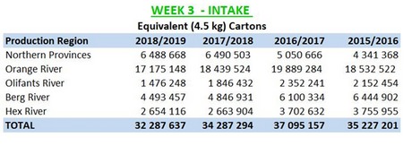 Olifants River的生产商正在完成Red Globe的包装。与此同时,伯格河正在全面生产。红色和黑色品种的着色很好。已经包装的早期品种包括Joybells和Sugra 13。生产商正在包装Firestar,Tawny,Regal和Sable品种。