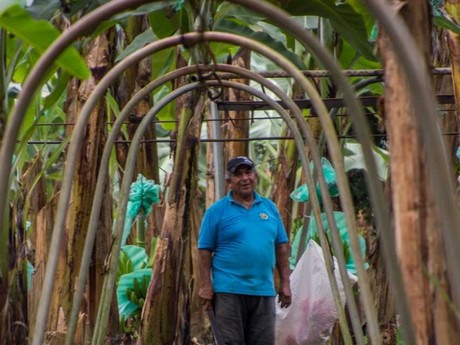 Hugo Rocafuerte Vera检查香蕉树(照片来源:Carson Ingley和Brendan Pate)