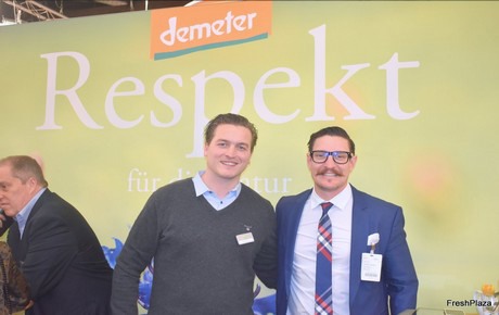 正在洽谈中的合作伙伴:Direct Fresh GmbH销售经理Felix Stamer(左),和Demeter生产商Fernando Monsalve(右)今年在纽伦堡BioFach的Demeter展位