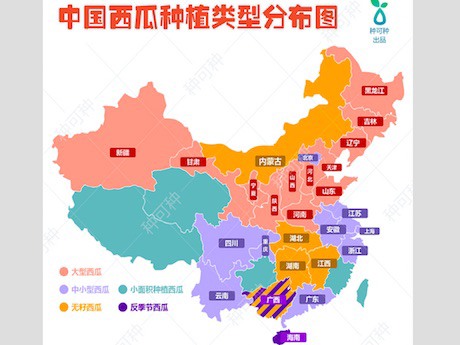 西瓜是夏季热销的水果,中国各地区均有栽培西瓜,且西瓜类型多种多样,南方以中小果形为主;北方以大果型为主;湖北湖南及广西以无籽西瓜为主;广西和海南是反季节栽培西瓜主产地区;福建、贵州、西藏、青海则种植面积较少。除了类型多种多样,各地区西瓜品种也是百花齐放。