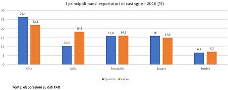 主要的欧洲生产国是土耳其(29.3%),意大利(24.3%),希腊(16.7%),葡萄牙(13.9%)和西班牙(7.3%)。 意大利生产数据基于历史数据,因为Istat自2008年以来一直没有收集国内板栗产量的数据。因此,这个数字并不代表意大利生产的现状。