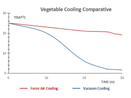 “真空冷却是已知的最快速的冷却技术,任何多孔产品的自由水和工作原理蒸发冷却,大大提高了产品质量。它还可以提高产品的保质期,同时降低整体冷却成本。使用该方法的优点包括:最快的冷却方式,冷却均匀,高能效,让作物更新鲜,使在恶劣的天气条件下(如下雨)也可以进行收割。缺点为:对叶子类蔬菜,蘑菇,辣椒,玉米,草莓等冷却效果非常好,但对一些厚实的蔬菜水果不适合,如芒果,胡萝卜,番茄等”