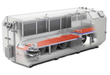 据Plotean称,实现高效率应始于莓果的预冷流程:“独立散冻莓果的加工流程始于产品的清洗和切丁。接下来一步是独立散冻阶段的预冷和精加工流程。”在预冷阶段,莓果进入独立散冻机时的低进料温度至关重要,这能转化成优质的独立散冻莓果。 “浸入式水冷冷却机冷却机由OctoFrost制造,在制造时考虑到了这一优先事项。浸入式水冷冷却机冷却机中的冰水将产品的核心温度降至5摄氏度以下,从而实现有效的独立散冻。较低的进料温度同时也将脱水率降至最低,从而提高了单位产量。经过全部流程后,最后留下的是高品质的独立散冻产品。