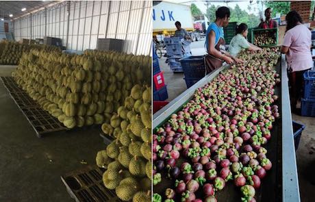 悦好果品泰国团队对“金海”牌榴莲和山竹进行严格分拣包装