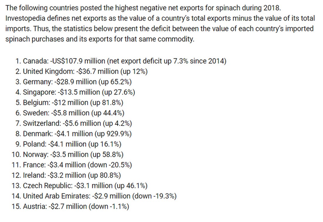 在各大洲中,欧洲国家在2018年期间出口了价值最高的新鲜菠菜,出口额为1.84亿美元,占全球总量的一半以上(53.4%)。紧随其后的是北美占42.4%,远超亚洲菠菜出口商的3.5%。