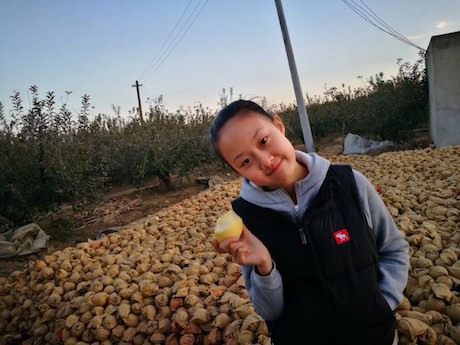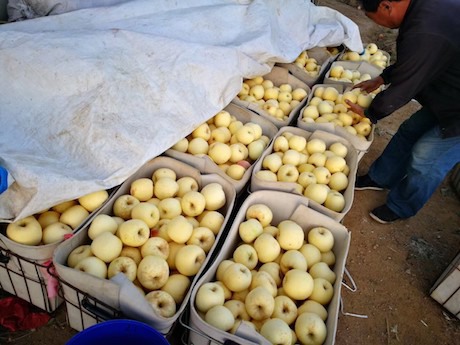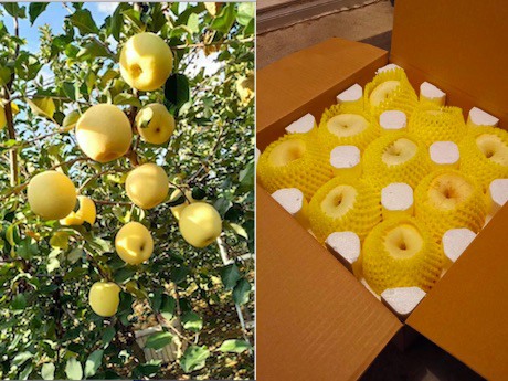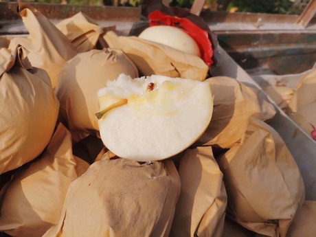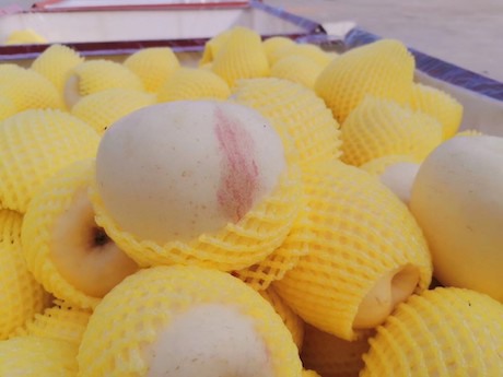“黄金富士是在几年前开始在市场兴起的。在烟台地区,黄金富士的种植面积并不少。这一改良品种是在很多红富士苹果过早被采摘,导致果子口味不佳的背景下而兴起的。为了保证果子的良好口感以及不被晒伤,黄金富士在收获时是连着袋子一起被采摘下来的。”