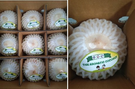 “我们的工厂位于泰国香水椰的核心产区-泰国中部的丹嫩沙朵县,其地区拥有湄公河入海形成的滩涂区,入海口三角洲的冲击地带淡咸水混合,营养物质丰富,土壤黑而肥沃,近赤道的独特气候成为孕育香水椰的天堂。香水椰是被列入泰国保护品种的椰子,与市面上常见的甜水椰相比较,香水椰奶香浓郁、汁水充足。椰青26天结一茬果,产品可实现全年供应。每年香水椰的产量约一万柜左右,产品多供应至国内大型水果连锁超市、批发市场以及电商平台,我们工厂每月的加工量约为45-50条柜。” 高经理表示。