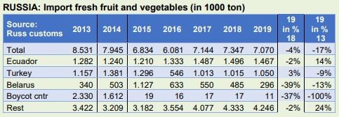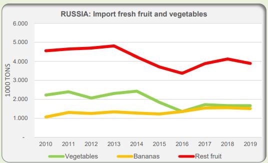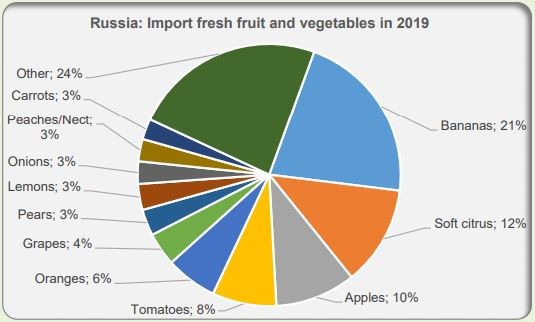 近年来,在2014年对欧盟的食品实施抵制政策之后,俄罗斯进口的新鲜水果和蔬菜有所回升。然而,2019年,这些进口再次下降。与2018年相比,俄罗斯水果和蔬菜的进口减少了4%。