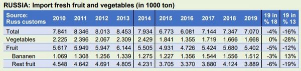 新鲜蔬菜进口保持与2018年相同的水平。但是,去年新鲜水果进口下降了5%。值得注意的是,不断增长的香蕉进口已告一段落。苹果、梨和桃/油桃的进口量急剧下降。这些水果的进口量分别下降了17%、16%和15%。