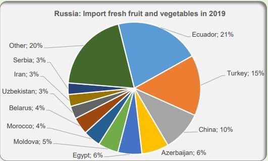 在向俄罗斯出口的国家中,厄瓜多尔是其最大的香蕉供应国。其次是土耳其和中国。从中国的进口减少了不少于百分之十。这突然终止了俄罗斯对中国新鲜水果和蔬菜进口的增长。特别是在2019年,中国苹果的进口急剧下降。去年,俄罗斯从中国进口的橘子和西红柿数量要少得多。但是,去年,中国产品在俄罗斯市场上表现良好。这些产品包括葡萄柚、白菜和甜椒。
