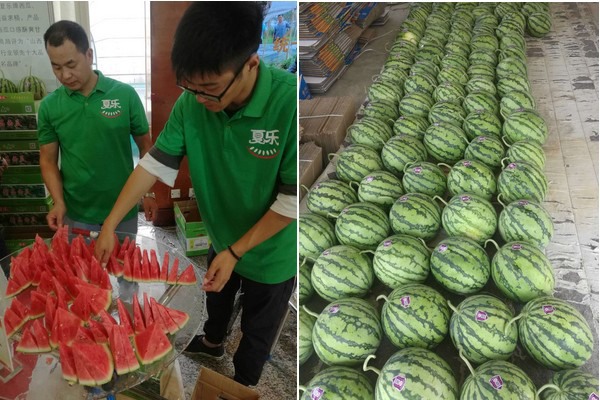 “今年我们引进了“绿虎黑皮瓜”这一新品种。绿虎黑皮瓜是自然无籽瓜,无需用药水培化,因此更加绿色健康。绿虎黑皮瓜的甜度可达14%-15%左右(其他品种西瓜糖分普遍在12-12.5%左右),且具有瓜皮韧性强,货架期长、耐储存等优势。”