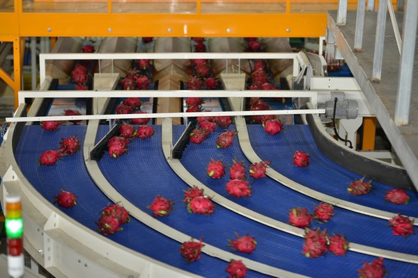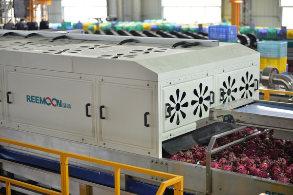 火龙果原产于西半球赤道附近,中美洲等热带地区,后传入我国,在海南、广西、广东、福建、云南等省区均有种植。其中,广西南宁拥有国内最大的火龙果生产基地,种植面积达22万亩。近年来,南宁大力发展火龙果产业,但火龙果的分选一直依靠消耗大量的人力物力单纯的人工操作,然而这种缺乏标准化的分选操作严重制约了南宁火龙果产业的发展。为了推动当地火龙果的品牌建设,南宁决定从火龙果产业的规模化,标准化、专业化入手,引入了江西绿萌所研发生产的火龙果自动化分选线,以改变成本高、效率低的人工分选现状。