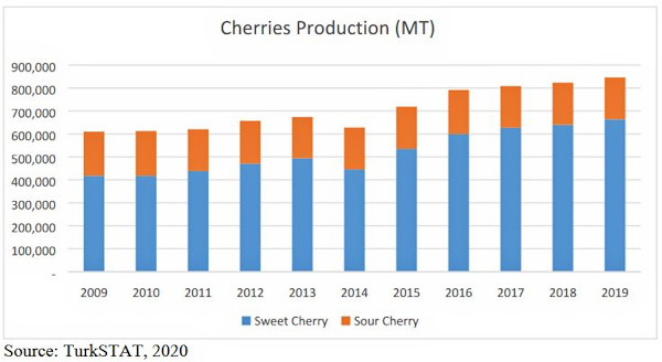 土耳其一直跻身于全球樱桃生产国之列,也是世界上最大的四大樱桃出口商之一。主要的甜樱桃种植地为Anatolie和Marmara中部地区,土耳其地中海地区和爱琴海附近也有樱桃农场。在这些地区,Konya、Izmir、Manisa和Denizli是樱桃种植最多的省份。