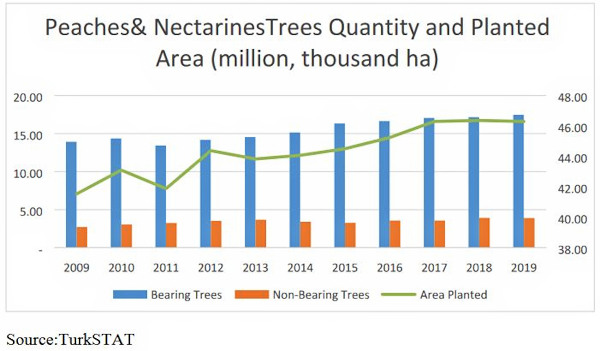 土耳其桃子产量不断增加。这是过去十年来出口市场和榨汁业新投资带来的结果,而种植面积保持不变。2019/2020年,土耳其桃子种植面积约为4.6万公顷。2019年,据土耳其官方统计数据,该国约有2100万棵桃树和花蜜树,果树数量从2009年的1400万株增至2019年的1740万株。