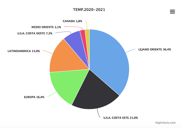 迄今为止,亚洲已经超越美国成为智利新鲜水果的主要目的地。截至上周二,智利向亚洲市场运送了613,691吨水果,比2019-2020年同期增加了15.28%。这种增长在很大程度上将受到对中国主要市场樱桃的出口增长的推动。