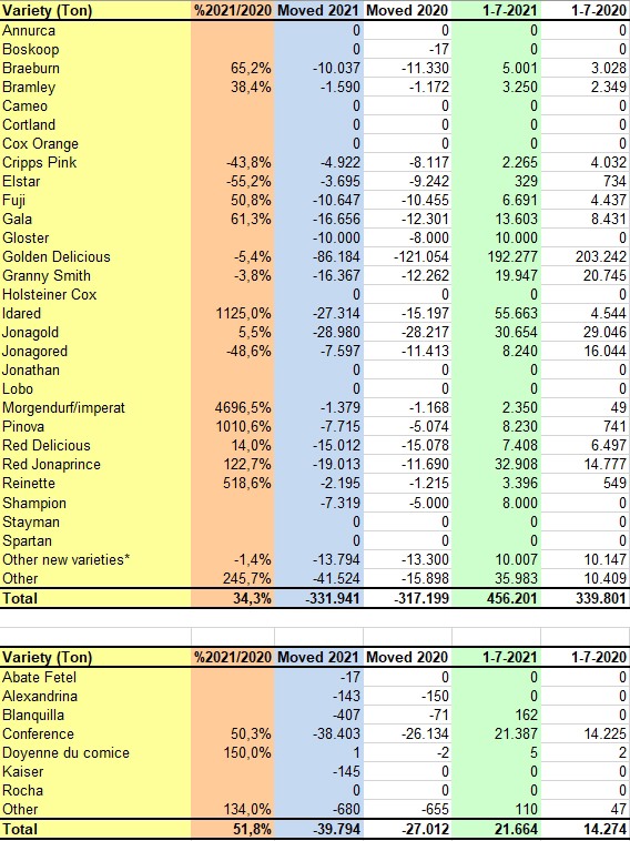 WAPA 已发布了 2021 年 7 月的北半球苹果和梨库存报告。报告显示,与去年同期相比,波兰的苹果库存量显着增加,增加了 1100% 以上。意大利的库存量相似,但与 2020 年相比仍增加了 21%。对于梨,比利时仍有 3,300 吨梨库存。与去年同期相比,荷兰的梨库存增加了约 31%。