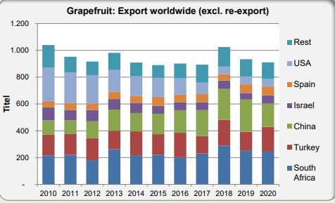 南非是世界上最大的葡萄柚出口国,年出口量约为 25万吨。 土耳其和中国位列第二和第三,荷兰排在第四。 当然,这其中涉及再出口。 其他中等规模的“直接”出口国是以色列、西班牙和美国。