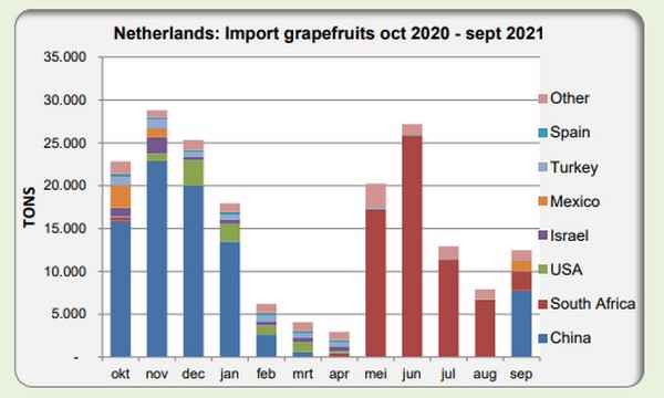 除了九月份,中国和南非的供应季时间几乎没有重叠。通常,中国从10月到2月初供应荷兰, 而南非葡萄柚从五月到九月初抵达荷兰。 此外荷兰还从美国、以色列、土耳其、西班牙、津巴布韦和斯威士兰进口葡萄柚。