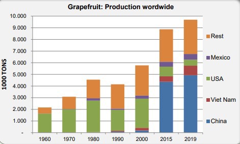 同期,美国的产量却从 250 万吨下降到 50 万吨。 排在中国之后的是越南,越南现在是世界第二大葡萄柚(柚子类)生产国,产量约 80 万吨。 之后是墨西哥的50 万吨和南非的40 万吨。Fruit & Vegetable Facts的 Jan Kees Boon 说。