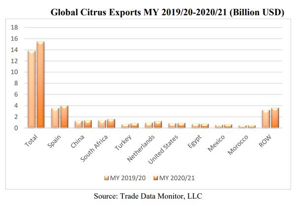 在 2021/22 年度,由于欧盟主要柑橘生产国的不利天气条件,欧盟柑橘产量预计将比上一季下降 6.8% 至 10.7 MMT。国内供应的预期减少、大流行导致市场对柑橘的需求增加,此外酒店业的重新开放可能会鼓励欧盟柑橘进口。