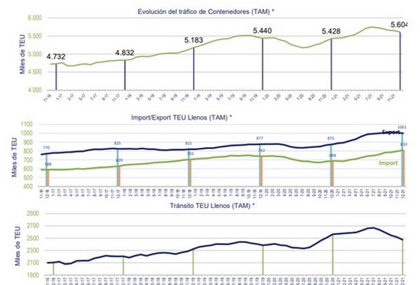 由于西班牙公司的进出口拉动,瓦伦西亚港口的货运量达到了 5,604,478 个标准箱,超过了大流行前的水平。集装箱货运量相对于 2020 年增长 3.25%,相对于 2019 年增长 3%。