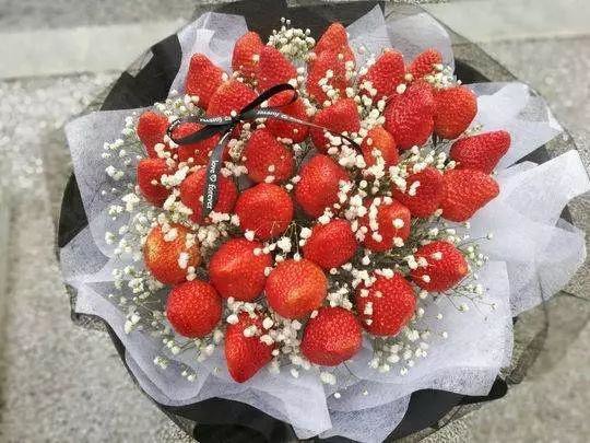 在情人节之际,水果花束用的最多的是草莓和车厘子,这主要是因为这两种水果的红色的喜庆颜色和适合制作成花束的果子大小。